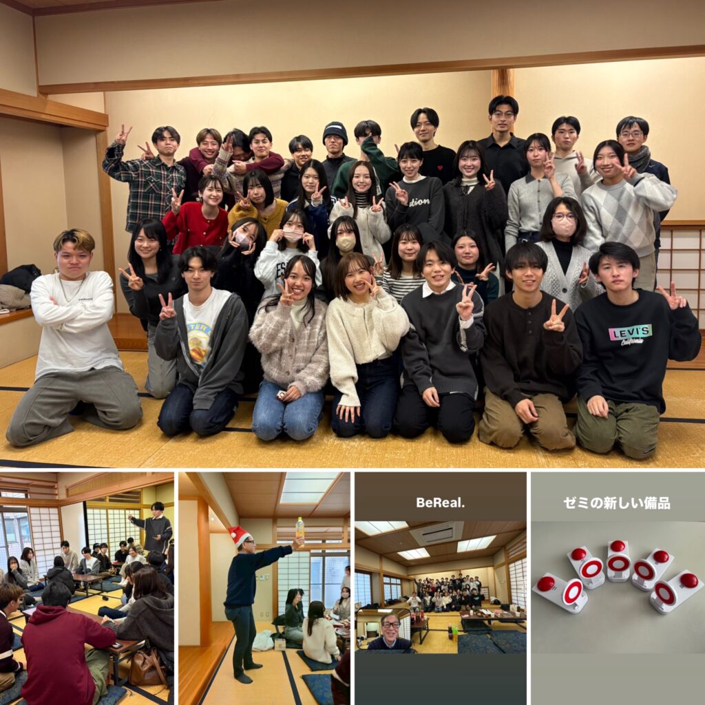 恒例となったゼミクリパをしました(2025年12月23日)。会場はくすのき会館、イントロクイズ、NGワードゲームと懇談、という感じでした。